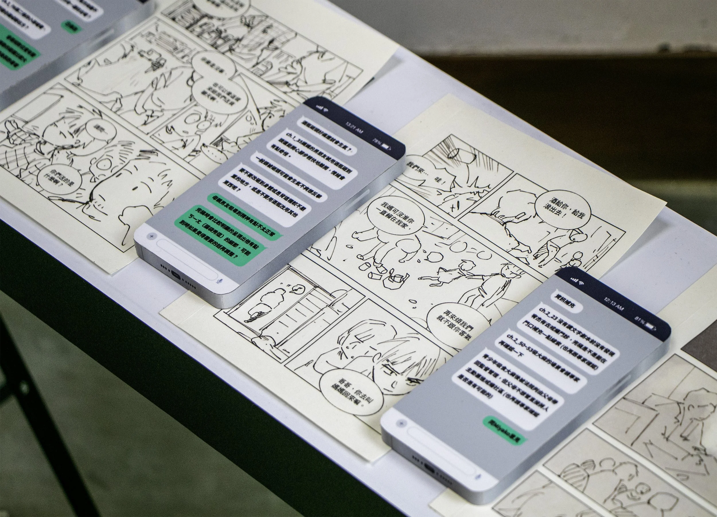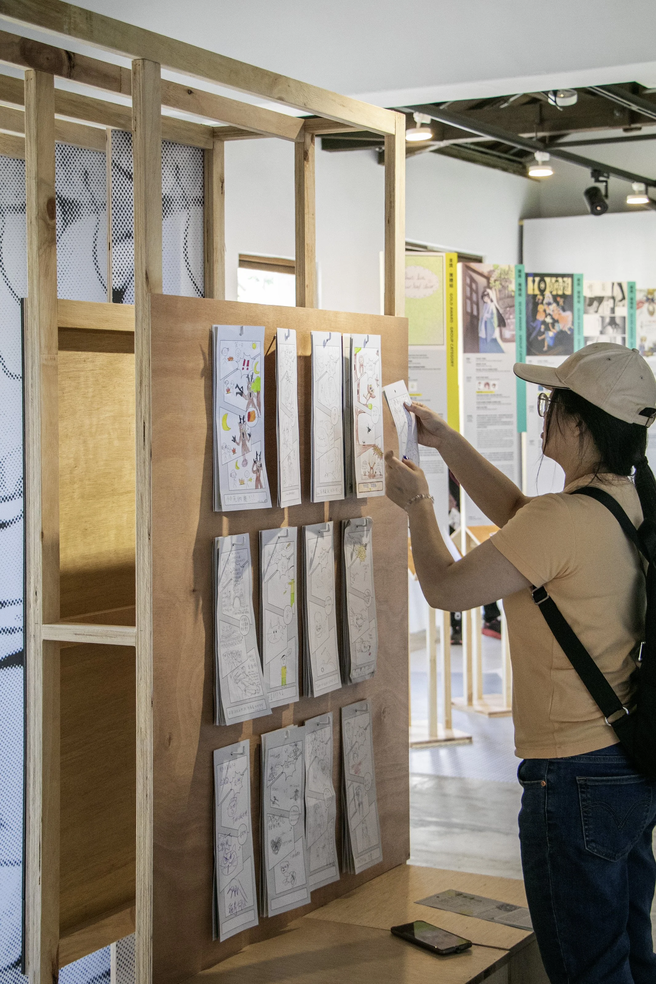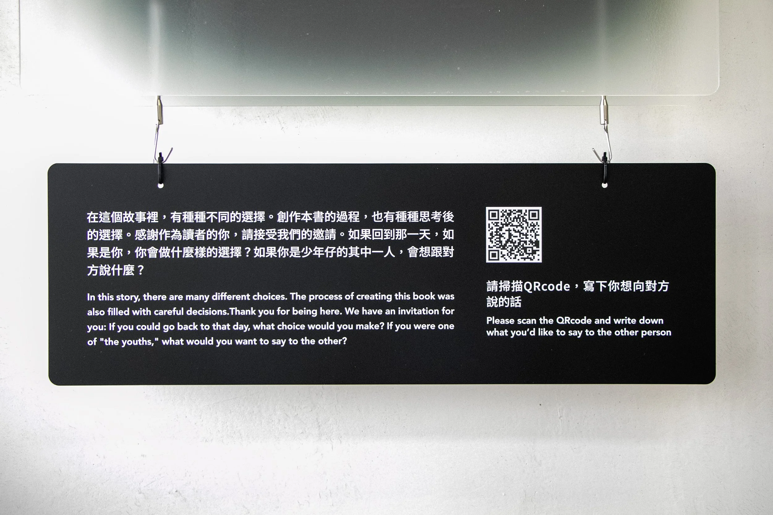 最後,我們邀請觀眾參與故事的情節設計,透過「觀眾的選擇」互動裝置,讓大家重新構思:若回到漫畫的關鍵轉折場景,你會如何設計對話,讓角色說出那句藏在心底的真心話?