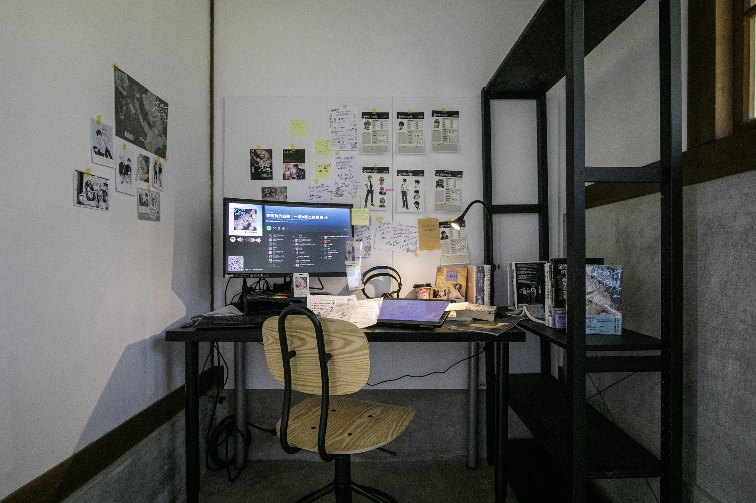 在設計發展的過程中,作者認為若能有一個模擬創作環境的小空間,將能賦予觀眾更深的帶入感。空間內擺放著創作時時不時翻閱的書籍、角色設定、循環聆聽的歌單,以及漫畫家近乎自言自語的靈感筆記;同時透過繪圖板展示作畫過程,讓觀眾彷彿闖入私密的創作現場,在每個筆觸間回到創作的時空中。