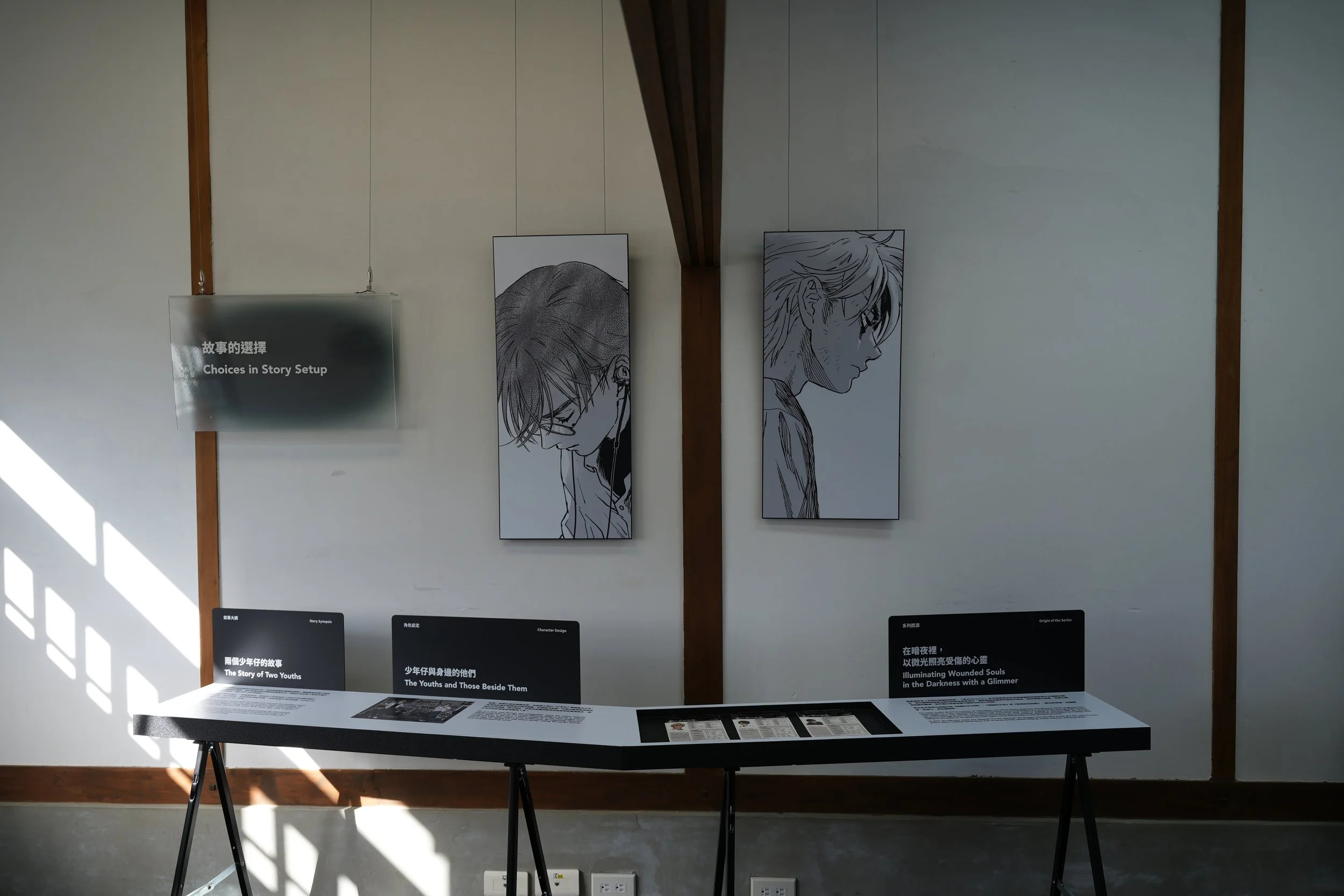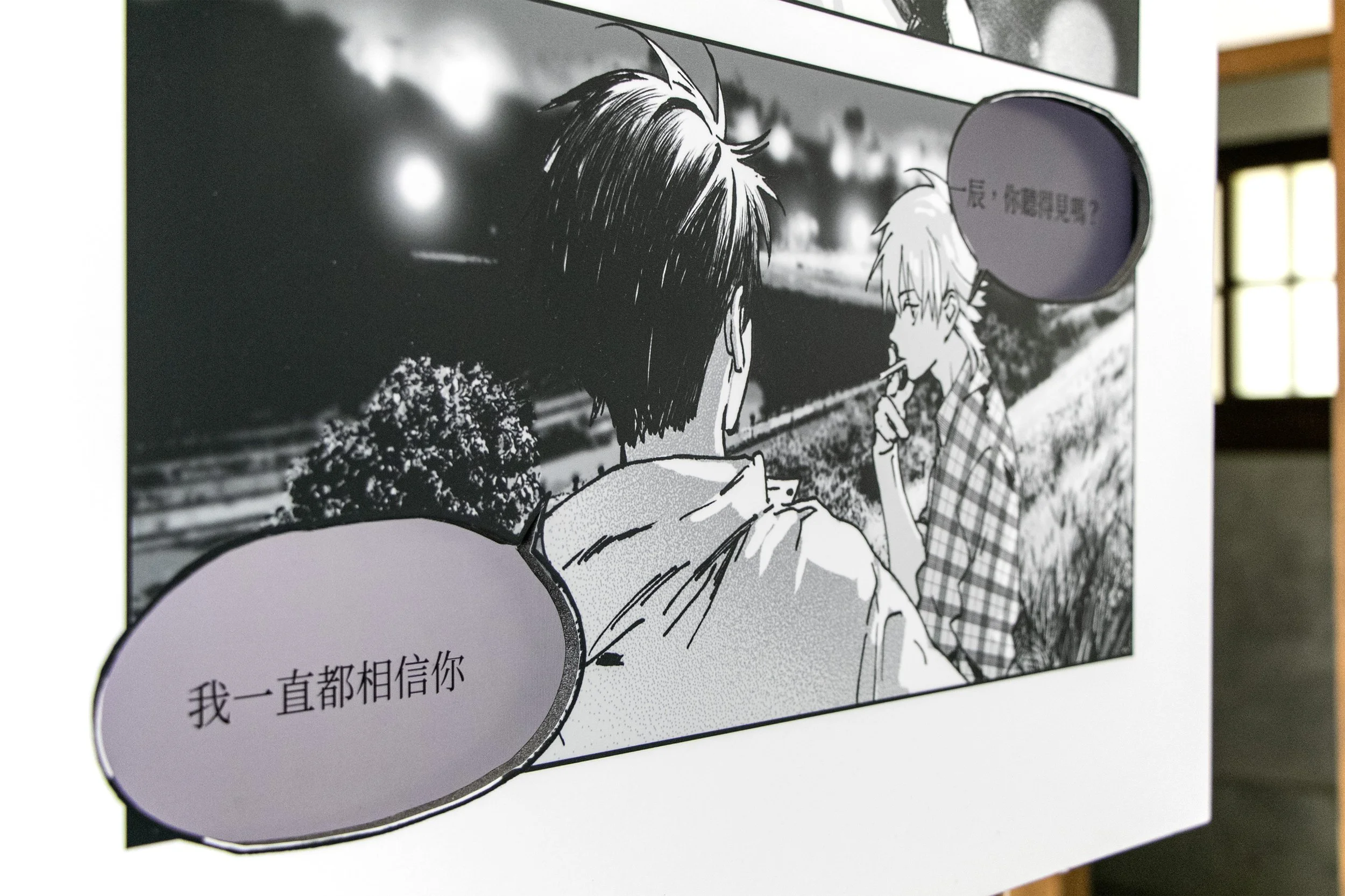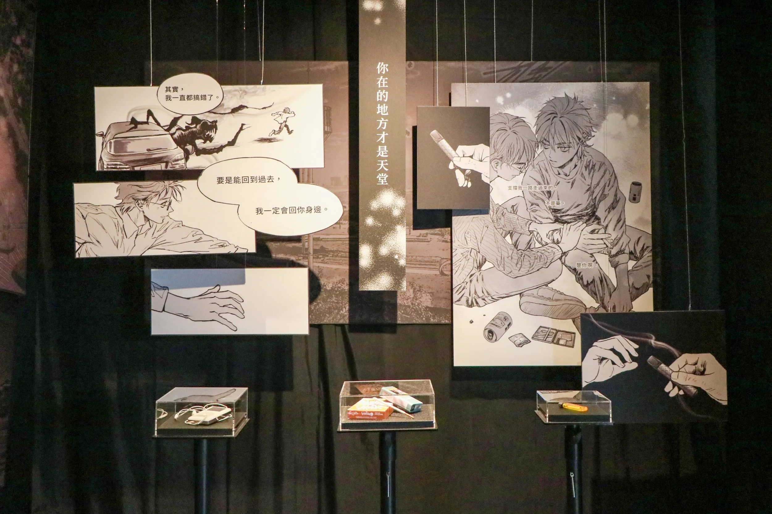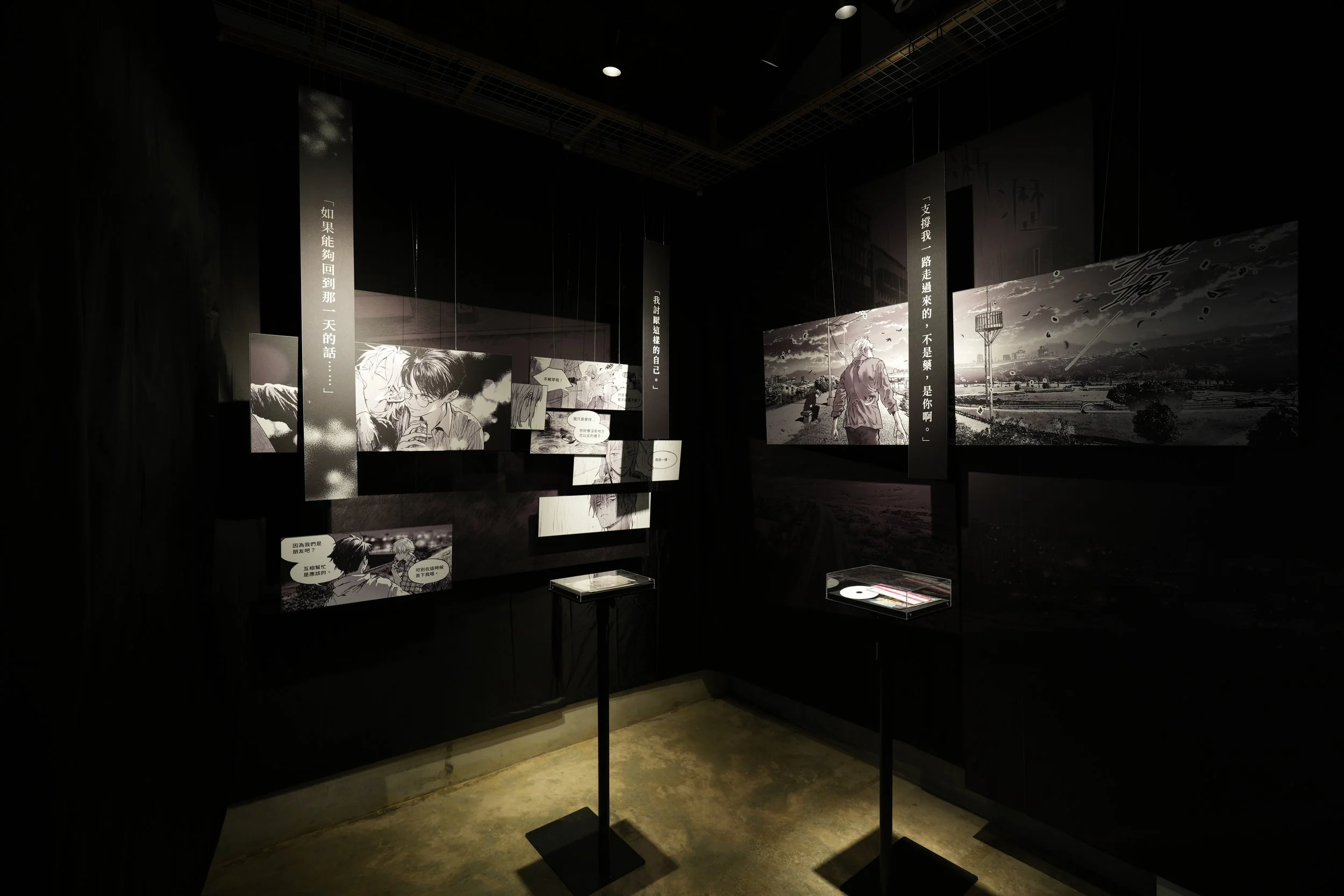 展場以包覆感強的暗室搭配空間中迴盪的主角對話,引導觀眾靜心感受漫畫世界。牆面交織展示關鍵分鏡、經典對白與象徵物件,透過錯落吊掛的佈局,還原作品中少年彼此救贖的故事。