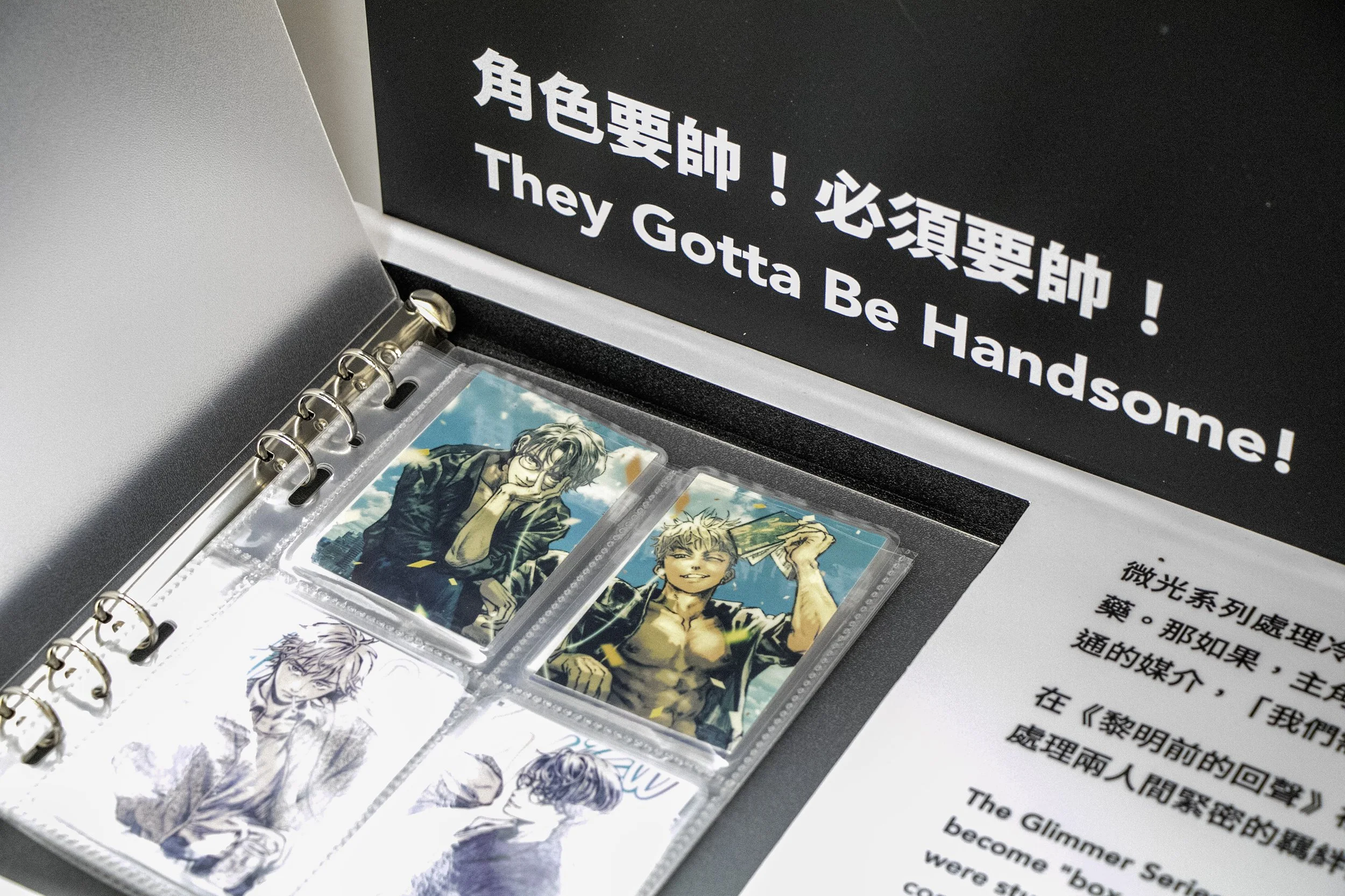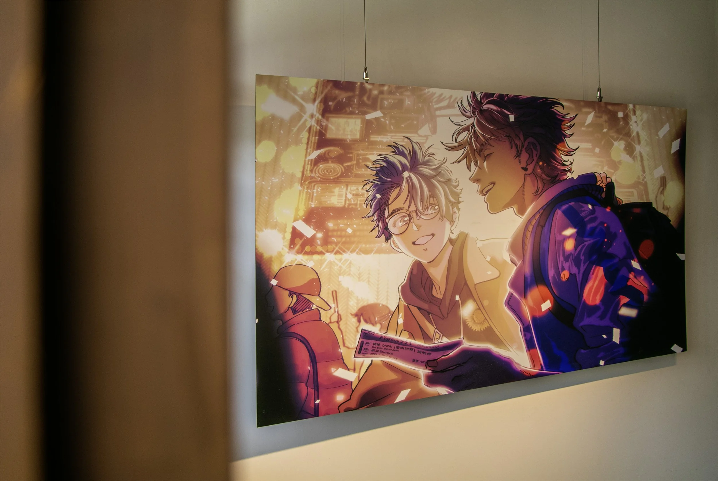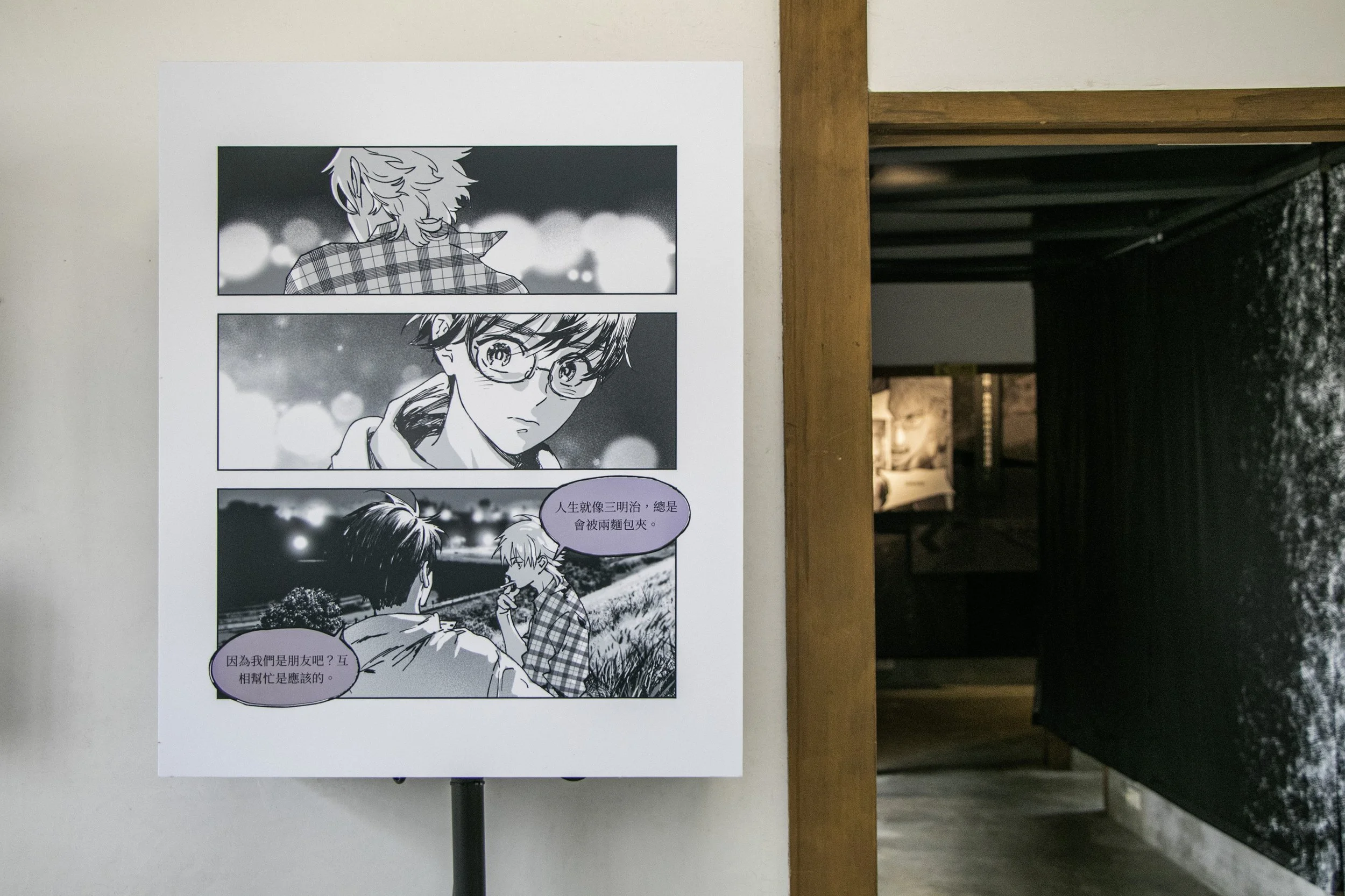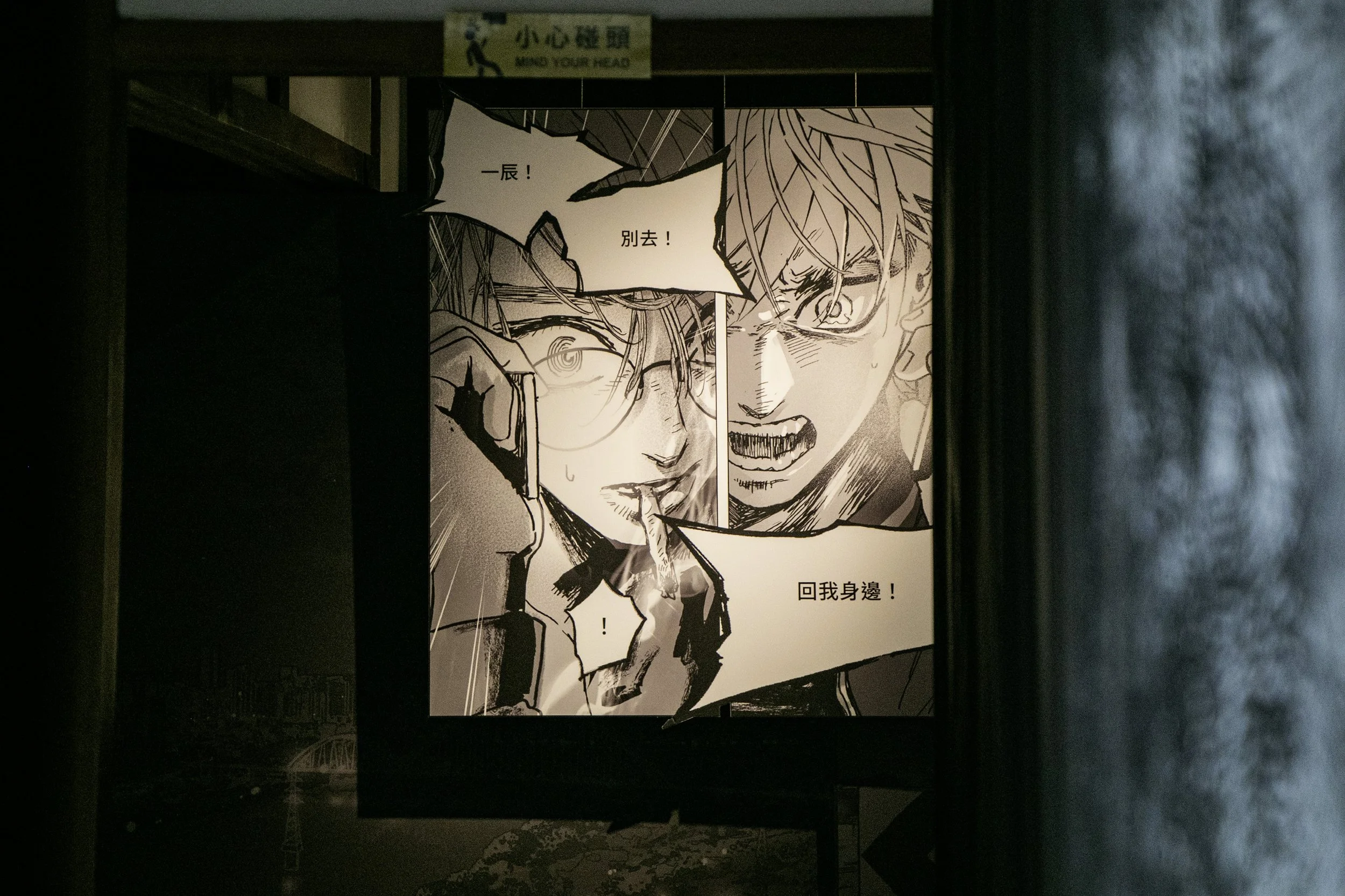 展場以包覆感強的暗室搭配空間中迴盪的主角對話,引導觀眾靜心感受漫畫世界。牆面交織展示關鍵分鏡、經典對白與象徵物件,透過錯落吊掛的佈局,還原作品中少年彼此救贖的故事。