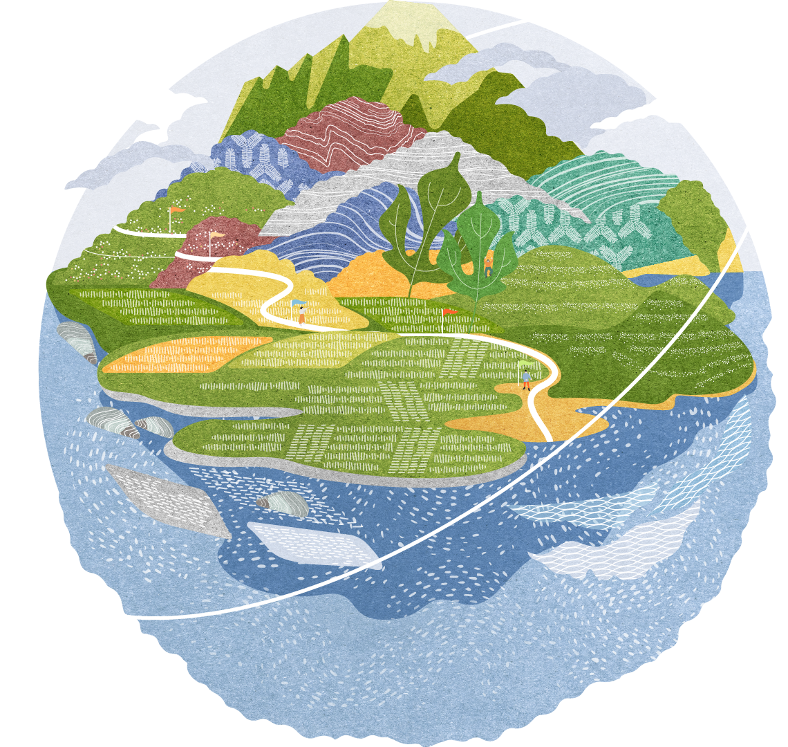 北回博物島的核心概念,是把「看不見的北回歸線」轉化為一條可被走讀的文化帶路:它不是一座被圍牆圈起的博物館,而是一座散佈在臺灣山海與生活紋理中的「開放式展島」。因此,我們以「島嶼地景即展品」作為主視覺的敘事邏輯,把旅人會在路上看見的線索:梯田的節理、稻浪的層次、魚塭與海岸的格網、岩層的褶皺、漁網與洋流的流線…轉譯成可閱讀的圖像語彙,讓每一塊色域都像一件被策展的標本。既保留真實地景的結構感,也以插畫的方式建立親近、可進入的觀看距離。
