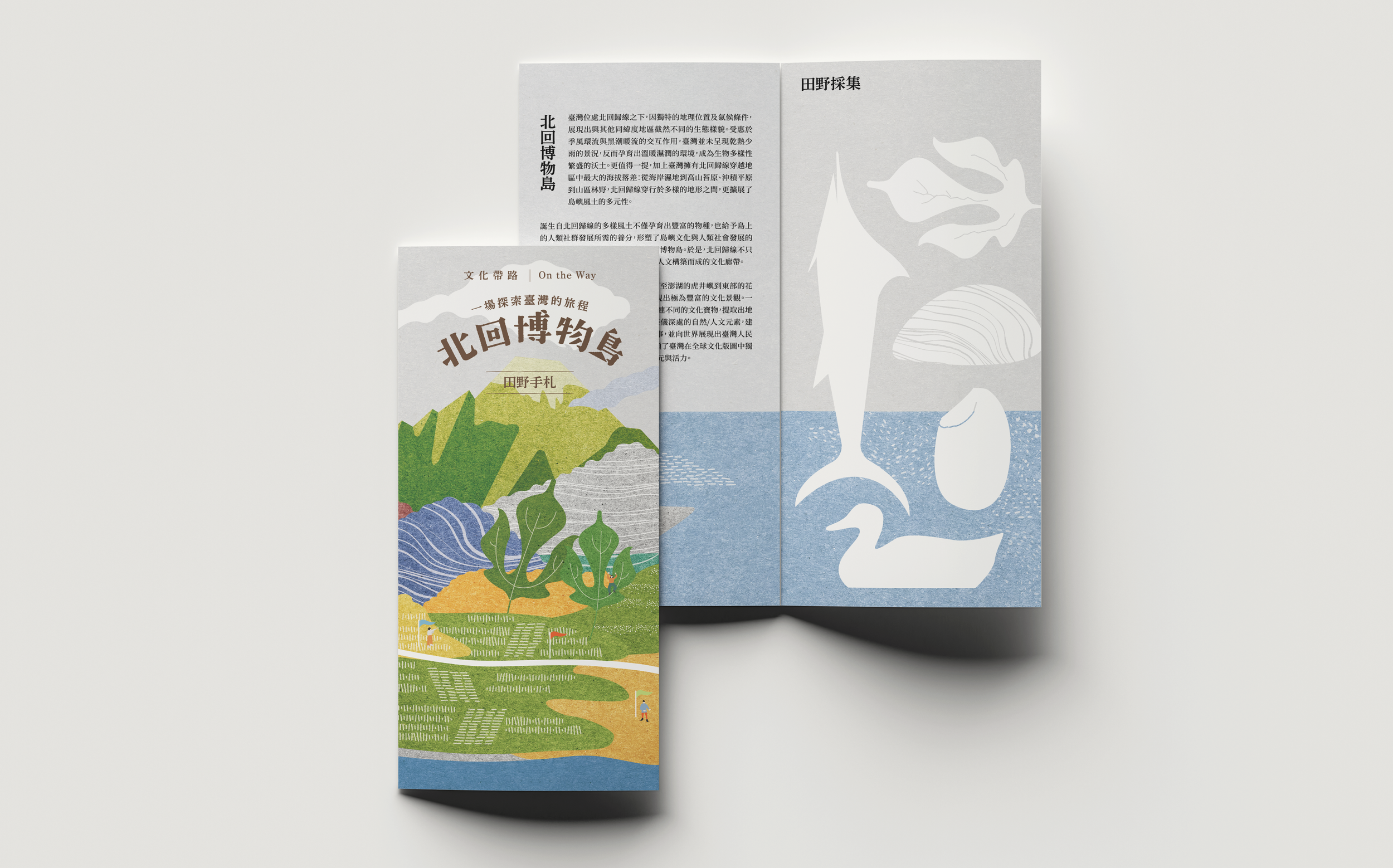 視覺中央的「島」,象徵北回廊帶的多樣地貌與文化切面;環繞其外的軌跡線,則承接「帶路」的概念——像一條正在書寫的旅行路徑,把不同節點與故事串連起來,暗示「移動本身就是導覽」。在材質語言上,我們採用溫潤的紙感肌理與低飽和的熱帶色盤,回應海風、日照與潮汐的島嶼記憶,讓整體氣質介於「地圖」與「故事書」之間:理性可讀、感性可感。